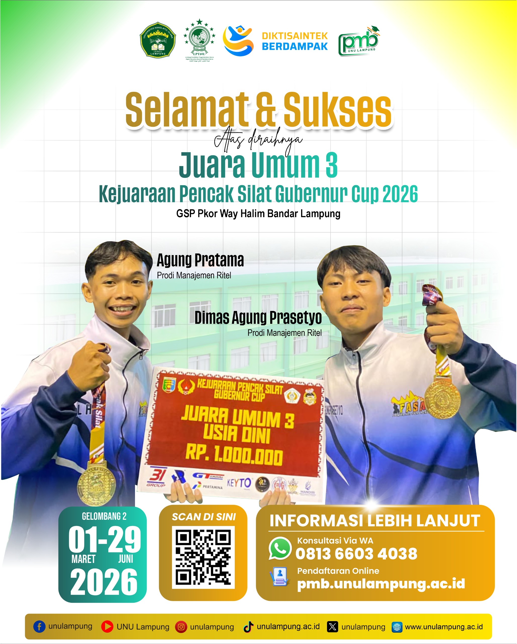 Selain itu, keberhasilan ini juga menunjukkan bahwa UNU Lampung senantiasa mendukung pengembangan minat dan bakat mahasiswa melalui berbagai kegiatan kemahasiswaan, termasuk pembinaan di bidang olahraga. Dukungan tersebut diharapkan mampu melahirkan atlet-atlet berprestasi yang dapat menjadi kebanggaan universitas dan masyarakat. Ke depan, mahasiswa tersebut diharapkan dapat terus meningkatkan kemampuan serta meraih prestasi yang lebih tinggi pada ajang-ajang berikutnya, sehingga mampu membawa nama baik Universitas Nahdlatul Ulama Lampung di tingkat yang lebih luas.