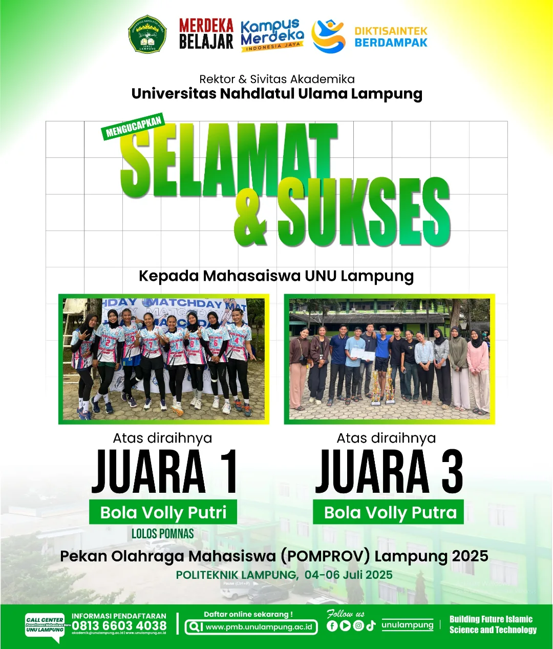 Universitas Nahdlatul Ulama Lampung kembali menorehkan prestasi membanggakan pada ajang Pekan Olahraga Mahasiswa Provinsi Lampung 2025. Mahasiswa UNU Lampung berhasil meraih Juara 1 cabang olahraga Bola Volly Putri dan Juara 3 cabang olahraga Bola Volly Putra.